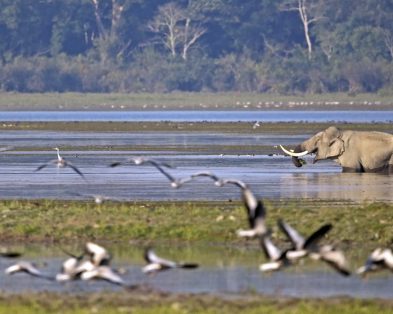 On our route we skirt the edge of the Himalayas, visiting three national parks in search of the wonderous and rare birds and mammals. Nestled in along the shore of the enormous Brahmaputra River, Kaziranga National Park hosts 2/3 of the world’s population of Indian Rhinoceros, and also holds the world’s largest populations of wild Water Buffalo and Barasingha (a.k.a. Swamp Deer).